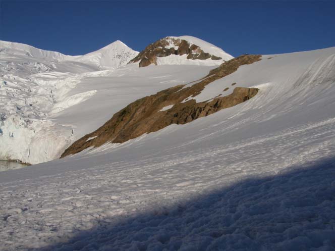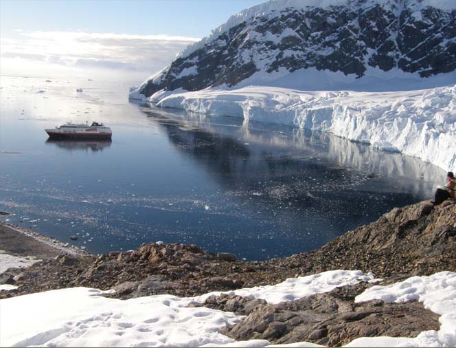 最初、雪の丘に登ってみたのは、南極半島のニコハーバー。氷河が迫る港に船を止め(写真2)、ゾディアック・ボートで、ペンギンに迎えられて上陸、写真3の手前の丘まで登る。ペンギンが途中まで登ってくる。長靴とパーカーの防寒衣装の上に救命衣という格好なので、雪は深く滑るし、南極で汗をかく経験ができた。下りは、滑り降りる人もいて、斜面に筋跡が残る。