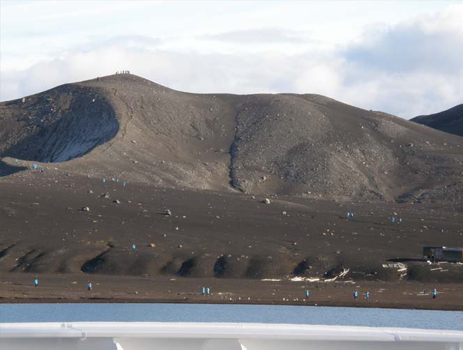 二回目に登ったのは、写真4の丘、雪がなく、ガレキの斜面で脚をとられ、ここでも汗をかいた。ここはサウス・シェトランド諸島のデセプション島、火山の噴火口が崩れ、そこに海水が侵入して形成されたカルデラ湾になっている。一か所海水通路があるだけでカルデラを囲んで小高い丘が丸く囲む(写真5)。地下の火山活動のため、温かく、雪が積もらない。海水も比較的高く、泳ぐ人もいた。作業しやすい島でもあり、クジラの解体場、ペンギンの油を採った機械工場など廃墟として残る。