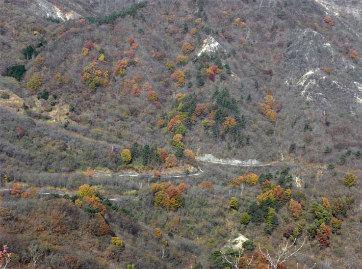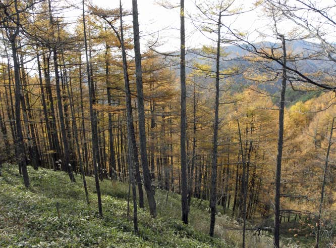 登り始め、西側斜面はススキの穂が揺れ、足元はササの絨毯、山に入りカラマツの黄色のカーテン(写真中)、先は落葉樹の樹林帯。階段のあるやや急な登りの後は尾根道、最後に上り詰めて頂上。途中、展望はよくないが、頂上は全開、下に走ってきた舟石林道沿いの紅葉(写真上)、足尾の部落と北の日光の山と奥の男体山。西に庚申山と皇海山、袈裟丸と続き、反対側には夕日岳など前日光の山々。