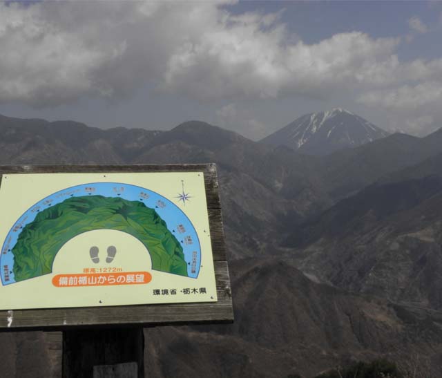 写真下は、春登った時のもの、奥の男体山、左に社山、手前に松木渓谷、足尾の精錬所跡。案内板が新しくなって、見える山の展望を示す。このときは、山はヤシオツツジの濃いピンクで染まっていた。早春だとダンコウバイの黄色が見られるようだ。