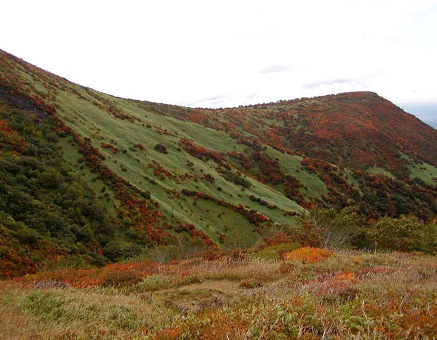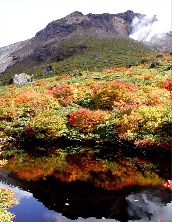 茶臼岳には、那須ロープウェイで、山頂駅まで気軽に来てしまうので、ガレキを30分ほど登ると頂上。周りの眺望は抜群だが、この登りでは、紅葉は身近では見られない。車の終点まで来て、ここから歩くと、紅葉が満喫できる。峠の峰の茶屋までの登りで、右側に望める朝日岳から鬼面山にかけてのササの緑と紅葉のコントラスト(写真上)が独特で好きな景色の代表。峠を越えて、三斗小屋へ下りると紅葉の林に入る。三斗小屋温泉では、宿泊客用ですと言われ、湯を使うことはできなかった。三斗小屋から御沢を渡り、茶臼岳に戻る。茶臼岳の裏側に当たる姥が平の池周辺の紅葉は最高、噴煙が上がる茶臼の黒い斜面と、池に移る紅葉のバランスが見事だ(写真下)。牛ヶ首に出て、稜線を南に向かうと、日の出平、南月山に出る。紅葉も続くが、春に訪れるとミネザクラが楽しめる。天気の良い日、富士山がかすかに見えたこともあった。日の出平からササの斜面を下ってもいいし、南月山を越え、先の白笹山を登って下ると、沼原の湿原に出る。