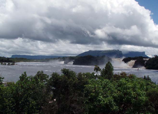 悪魔の谷にはボートで入るので、水量の多い雨期を選んだけれど、反面天気が予想できない。カナイマのロッジで、天気調整のため3泊したけれど、幸い天気には恵まれ、エンジェルフォール鑑賞は堪能できた。ロッジの前は、テプイをバックにカラオ川が広がり、湖のようなカナイマ・ラグーン、ここにはいくつもの滝が落ち込んでいる(写真下)。水量が多く、ごうごうとして迫力満点。その中の一つ、エル・サポの滝は滝裏に入りこめ、水のカーテンの中を歩いてみた。不注意で、濡れた岩に滑り、尖った岩角で肘を切ってしまった。川の水はタンニンで茶色をしているが、傷に効くのか、出血も短時間で止まった。ロッジのある村に来ていた医師が診てくれて、3針縫ってもらった。診療費は要らないという。好意は受けて、薬代だけ置いてきた。ロッジで働いている地元の人たちも皆親切。夜は子供たちが集まり、歌や踊りを披露してくれ、一緒に踊に誘われた。滝鑑賞も素晴らしかったし、フレンドリーな人たちのことも印象に残る。