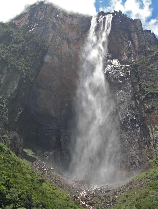 ここからは歩き、赤道に近い熱帯雨林の蒸し暑い中を1.5時間登る。最後急な登りがあるが、比較的緩やかなジャングルの道だったが、足元は、樹の根が露出したり、ぬかるんだりで歩きにくい。目的地ライメの岩の展望台に出て、眼前の巨大なエンジェルフォールに驚愕、雲の上の天上から降り注ぐような感じに圧倒される。落差が大きくて、滝の水は下まで届かない。途中で霧雨になって、下に滝壺はない。展望台まで水煙が舞ってくる(写真3番目)。979mは、華厳の滝97mの十倍、華厳の滝観曝台から見て、十倍の落差は想像も難しい。