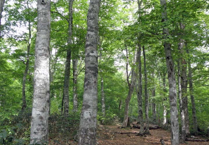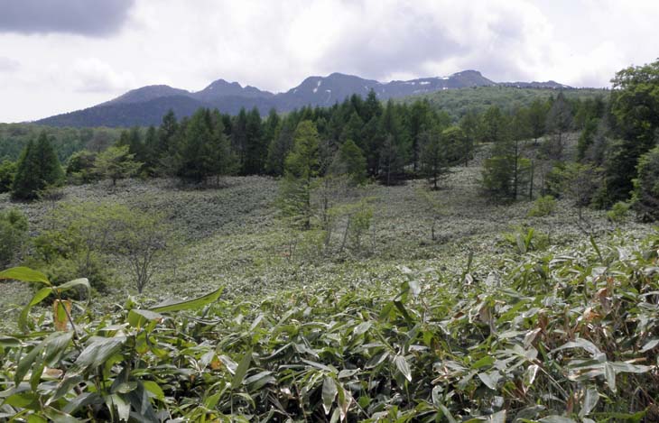 ダケカンバの林が続く。特にブナ林には気分が安らぐ(写真1)。急ではないが上り勾配の林のあと、比較的平らな歩きになり、小さな沢を何回か渡る。歩道の奥に田代湿原、ここでは湿原の花は見当たらず。この辺まで道が糠づき、踏み外すとズブっと足をとられる。写真2のサンカヨウの群落のほか、マイズルソウ、ツマトリソウ、キヌガサソウ、エンレイソウ、コミヤマカタバミといった可憐な花が目を楽しませてくれる。また、ネマガリダケの背の高い笹原が続くが、ササは切ってくれてあり歩くのに支障はない。ネマガリダケのタケノコをいくつかいただいて、帰ってから焼いて野趣でビールを満喫。 田代湿原で、半分ほどの行程、その先、花咲湿原(写真3)で、崩れかけた木道を歩く。ミズバショウはコバイケイソウに圧され小ぶり、ワタスゲ、リュウキンカが盛り。下って江戸沢通過、林道をわたって登った先、笹原に東屋、明るい笹原の彼方に武尊山(写真4)。下りの草倉沢沿いのカラマツ下快適な渓流歩きの後、林道、東俣駐車場通過、登って武尊キャンプ場のロッジに出る。レンゲツツジの高原を抜け、リフト乗り場に戻る。