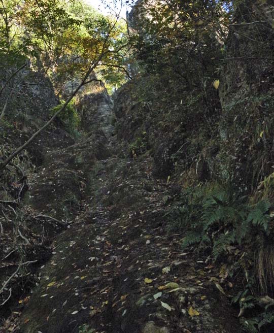 ここから北を望むと、写真4のように猿岩、入山峠と稜線路が続いているが、猿岩は危険と言われ、岩はかなり濡れていて滑りそうなので、断念して折り返した。出会った人から、いままで5回登ったけれどまだ猿岩を下りたことがない、怖いですと言われた。途中通過した下山路を下り里に下りた、30分ほど。小川沿いに、リンドウ、ノコンギク、カラスウリの赤い実など眺めながらの里歩きで日吉神社に戻る。