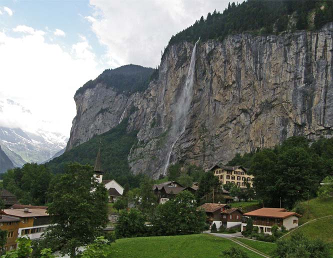 ミューレンの周りには、トレッキング・コースが数多くあり、趣向の違うハイキングができそう。ハイキングのほかに、滝めぐりもしてみた。ミューレンの谷下には、岸壁を流れ落ちる滝が多い。写真は、ラウターブルンネンの村に流れ落ちる、ヨーロッパ第二といわれるシュタウプバッハの滝。また、岸壁の岩の間を流れ落ちる地中の滝、トリュンメルバッハの滝では、岩にくりぬかれたエレベータで登りながら、見学ポイントから覗く、轟音を挙げて流れる迫力満点の滝も訪れてみた。