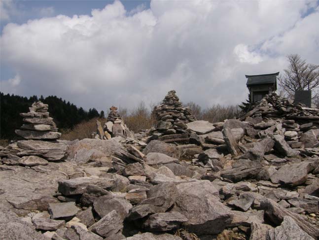 高原山連峰(写真上)の中、最高峰の釈迦ヶ岳の右のピーク、剣が峰には、矢板から八方ヶ原に入り、大間々台を登山スタート点にして登る。5月から6月にかけ、アカヤシオからヤマツツジ、レンゲツツジに変わり、高原が花一色になる。最初のジャリ道から分かれ、広葉樹の若緑の中を登って、尾根に出ると展望が開け、ガレ場の上に、八海神社の祠(写真2番目)、ケルンが積まれ休憩して展望を満喫。ここまで1時間ほど。ここからササと針葉樹の中を登りきると、矢板市最高峰の名板のある1590mのピーク。ここを剣が峰頂上として下山してもいい。なお先に、下って、また登ると剣が峰1540m(写真3番目)。登山口から1時間半、視界はなく、頂上という感じはない。