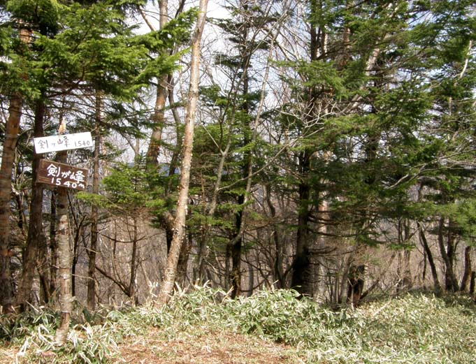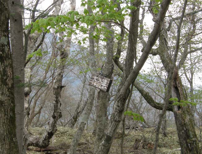 剣が峰から、ササの中を右に折れ、急坂を下る。後は登り下りをくり返し尾根筋を歩く。下りは滑りやすく、ロープの付けられているところもある。1時間ほどで大入道の頂上に出るが、途中、ダケカンバ、ブナの樹林、トウゴクミツバツツジ、シロヤシオ、オオカメノキの花と目を楽しませてくれる。大入道(写真下)は、平らな頂上だが、樹林に囲まれ展望なし。
