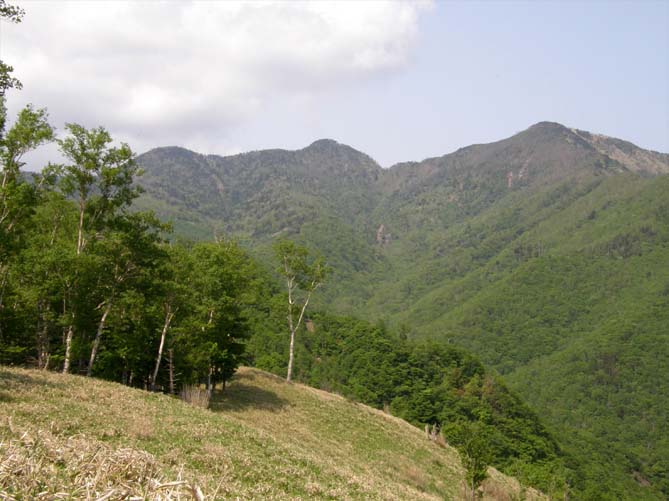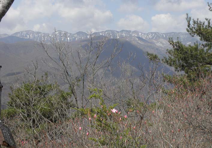 足尾の西、皇海山の南にある袈裟丸山は、いくつかの峰からなる連峰(写真上:足尾、備前楯山からの袈裟丸山)。国道122号線で足尾から下り、草木湖の先、小中から右に分岐して、小中西山街道に入る。舗装道から大滝、その先は荒れた林道。途中の大滝は、深い渓谷の中、谷に吊り橋が掛かり、樹林の奥に流れ落ちる滝で見ごたえがある。林道をかなり登って(大滝分岐より4.5km)、登山口の案内があり、車が何台か停められる。登り始めは、急な階段道、落葉樹の林の中を30分ほど登って、尾根に出る。ここからは右が開けてきて緩やかや尾根道、カラマツ、ナラ、シラカバが目立ち、快適な山歩きになる(写真中)。前方に袈裟丸連峰。ヤマツツジ、トウゴクミツバツツジ、シロヤシオが樹林の中に咲き誇る。途中にある石祠で道標:登山口から2.7km、後袈裟丸山頂1.7km。登りがきつくなり、シロヤシオ、アズマシャクナゲが見られる急登で後袈裟丸山頂(1908m)。展望が抜群、全方位。この先 北に中袈裟丸山(1903m)、奥に奥袈裟丸山(1957m)、この先入山注意になっていたので、今回は、途中で折り返した。中袈裟丸への下りには、アズマシャクナゲの花園、その奥に奥袈裟丸が望める(写真下)。