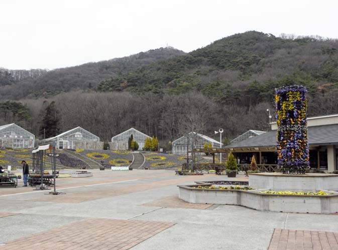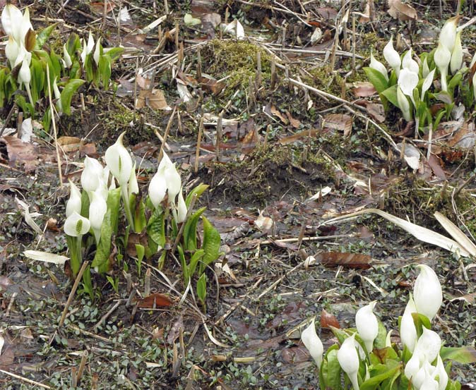東口広場のとちぎ花センターから見上げると、アンテナの立つピーク青竜ヶ岳が奥に眺められる(写真上)。ここから、湿地、池を横切って、広葉樹林の中を登る。標識は完備されていて、迷うことはない。自分なりのルートを選んで歩ける。最初は緩やかな登り、徐々に急な坂になってきて、歩きにくい階段道を登りきると頂上。居座った鉄塔の下、西南方向が開け、日光連山から栃木県南部の山々が展望できる(写真中)。南に富士山。北に急坂を下り、右の斜面に向かうと、カタクリ群生地に入り込む。蕾の群生が続く。カタクリの株の中に、アズマイチゲ、フクジュソウは花をつけていた。平地に下りて、湿地にミズバショウ(写真下)。北口から東口までは、山裾の田園集落の中、舗装路あり、畑道ありの里をのんびり歩く。途中、慈覚大師円仁の誕生の地とされる誕生寺や高平寺など立ち寄ってもという場所もある。頂上までの登り、1km、30分、下って30分、花を愛でながらだと1時間、里道歩きで、2km、30分。