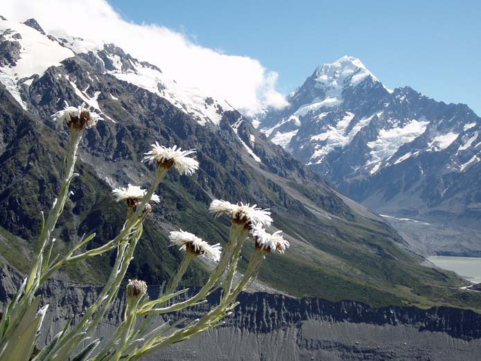 南半球に渡ると、半袖で夏のトレッキングができる。ニュージーランド南島の中央部にあるマウント・クックは、富士山に及ばないが3754mのニュージーランド最高峰、ただ、岩と雪と氷の嶮しい山で、鍛えたクライマーしか寄せ付けない。しかし、麓にはいくつものトレッキング用トラックがあって、各国からのハイカーが多い。その中の一つ、シーリー・ターンズ・トラックを登ってみた。