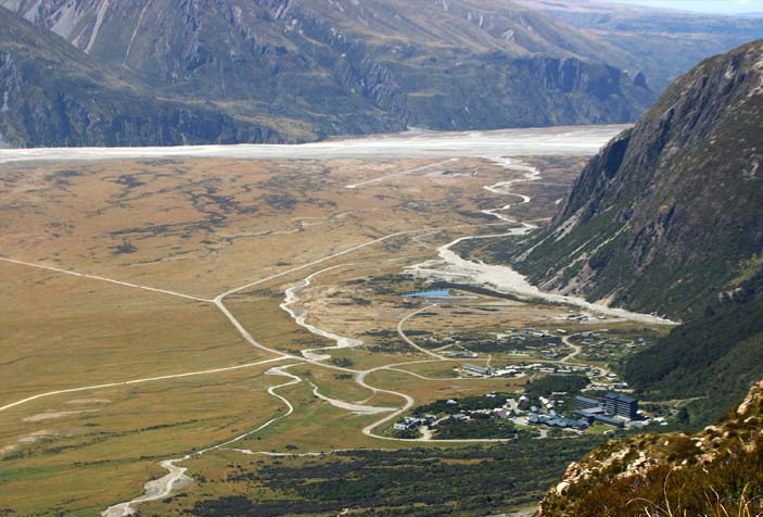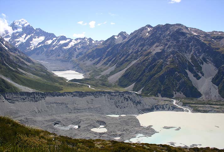 マウント・クック国立公園には、バスでクイーンズタウンから、白っぽいコバルトブルーのプカキ湖の畔を走り、谷の奥、マウント・クック・ヴィレッジに入ってくる。ヴィレッジの中心にあるハーミテージ・ホテルは観光客で賑わう。ホテルから平原の山裾側のケア・ポイント・トラックを1時間ほど歩くと、ホワイトホースヒルのキャンプ場に着く、ほとんど平坦だ。ヒルから道が分かれ、東にはフッカーバレー・トラック、ツアーのハイキング・コースによく組み込まれているルートだ。北に向かうケア・ポイント・トラックは残り短いが、ケア・ポイントというヴュー・ポイントに至る。ここからは、写真上のように、マウント・クック、奥のフッカー氷河とフッカー湖、手前の左から流れてくるミューラー氷河とミューラー湖の展望が素晴らしい。夏、氷河は、砂埃で白くない。