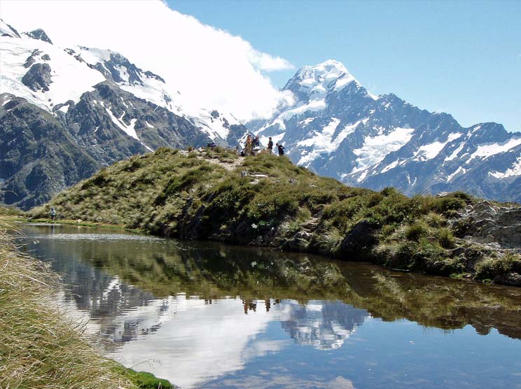目的地のシーリー・ターンズまで、登り2時間を越えてしまった。ターンとは、池のことらしい。池に映る逆さマウント・クックを始めまわりの山の展望は遮るものもなく堪能できた(写真下)。つらかった登りの労苦も報われる。ここからトラックは上に伸び、雪山に入ってゆくトレッカーがいたが、ここを終点に下る。登りでバテてしまって、帰りは休みながらもう一度景観を愉しみながら下る。