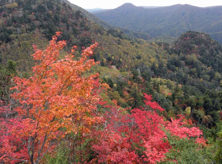 高原山の北端に位置する明神岳は、西斜面がスキー場になっていて、なかでも、北側のハンタ−マウンテン・スキー場は一番大きく、スロープも雄大だ。鬼怒川と塩原を繋ぐ日塩もみじラインの有料道路の塩原よりに大きな駐車場がある。ロープウエイで登っての終点、トップオブハンターから、下のセンターハウスまでのスロープ、見下ろしたもみじラインを囲む山々のもみじとみどりのパノラマが眼下に広がる(写真上)。