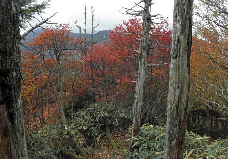 明神岳はもうすぐ上だが、ロープウエイ終点から遊歩道がぐるっと設けられていて、一周1時間ほどのコースで、もみじが満喫できる。日光連山展望台、関東平野展望台を含め、明神岳西峰山頂(1640m)、東峰山頂(1643m)も登ることになる。途中、釈迦ヶ岳へ通ずる分岐点があり、30分ほど釈迦ヶ岳に向け歩いてみた(写真中)、遊歩道に比べ、歩道は細く急だが、もみじは素晴らしい。東峰山頂を過ぎると、景観は開け周りの谷、山にかけての紅葉の色の変化が楽しめる(写真下)。はじめ下のセンターハウスから、歩いて山頂を目指してみようかなと思ったが、ダメと言われた。今、歩道はないらしい。