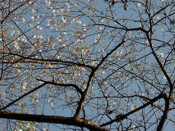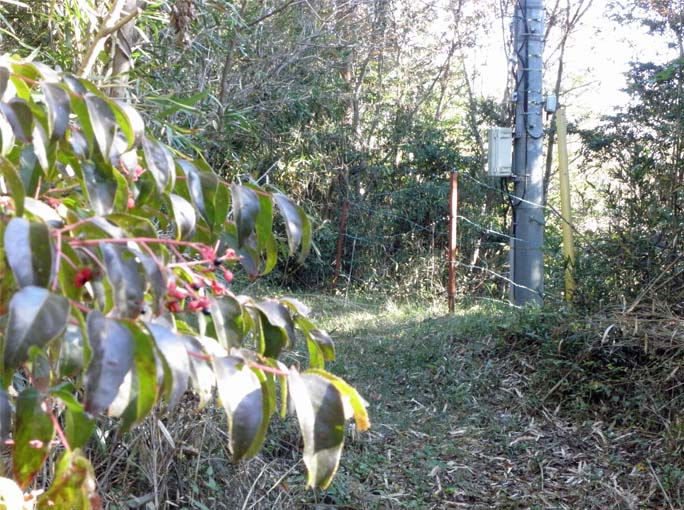 ここは、シキザクラの名所、晩秋から初冬にかけて、桜見物で訪れる人も多い。この桜(写真2)も、以前に比べると老木になってしまったのか花数が少ない。その代り、この時期の赤いもみじが見応えあり。頂上はアンテナが建つ道路の反対側、ブッシュの細い道を分けて入った先(写真3)。