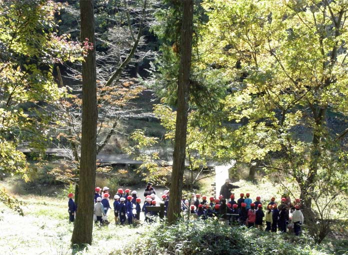 根本山公園として整備されているので、「根本山自然観察センター」を中心に、四季折々の植物、鳥、昆虫の観察ができるよう配慮されている。西の谷には、池のまわり、トンボ、サワガニ探索に子供たちが集まっていた(写真4)。