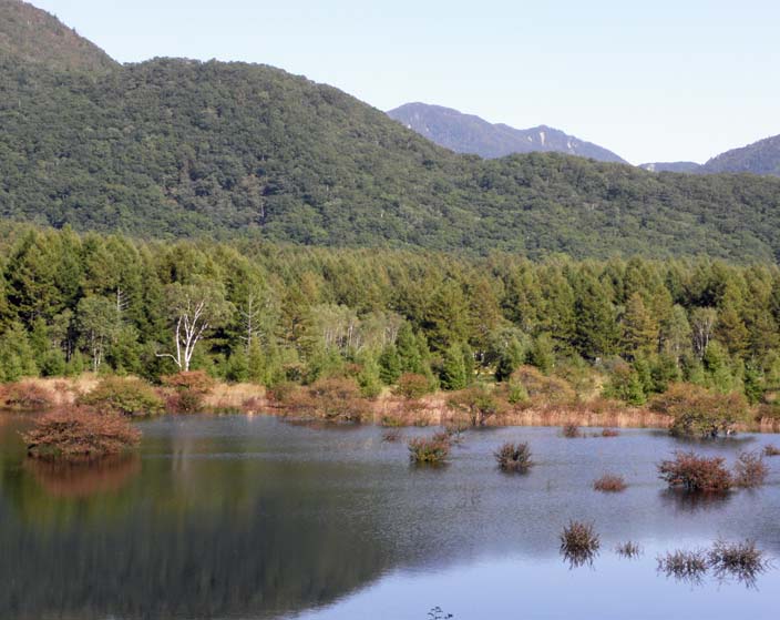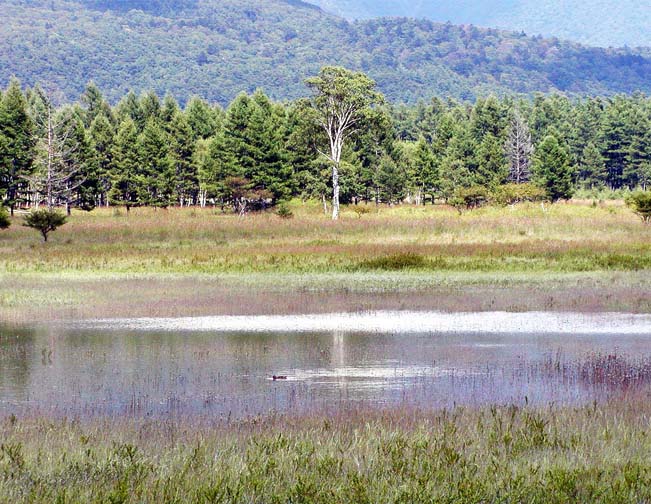 小田代ヶ原に湖が出現するのは珍しく、幻の湖になっていて、前回、湖が現れたのは4年前とのこと、私の記録写真では、2001年のものが残っていた。写真下のように、草紅葉と池が共存、印象的な景観に遭遇できた。