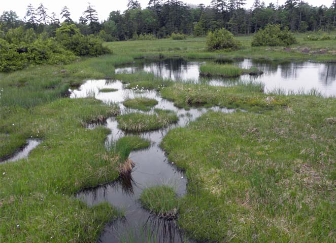 滝を眺めながらのこの山歩きも、終点は鬼怒川源流の鬼怒沼湿原(写真4)、出会った夏の花は、キンコウカ、イワカガミ、コツマトリソウ、チングルマ、ヒメシャジン、タテヤマリンドウ、コバイケイソウ、モウセンゴケ など。ここにはミズバショウはないのか見つからず。