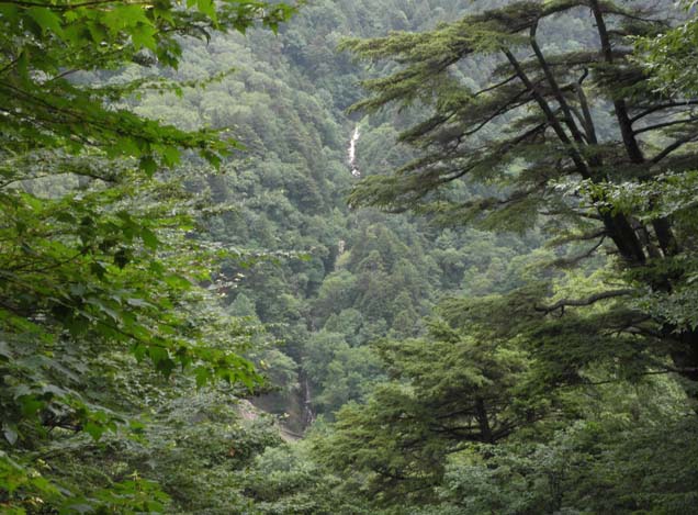 八丁奥の日光沢温泉からは、いよいよ川から離れ山登りになり、2時間強で鬼怒沼に至るが、急な登りが続く。登り始めてすぐ、イシの滝というすだれ状の滝が木の間から透けて見える。急な登りの途中、休憩ベンチがあって、ここがオロオソロシの滝(写真3)展望台。谷を隔てた対岸の滝が、数段に繋がって樹間に白い線を描く。展望台の下、崖ぶちにカモシカが姿を見せた。