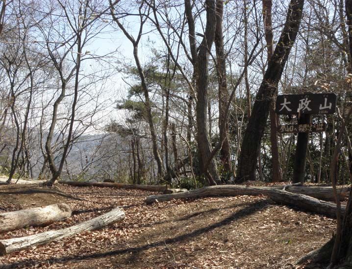 真岡市の南東にあるが、アプローチが判りにくい。つくば真岡線から、ゴルフ場:ゴールデンレイクカントリークラブを目指す。ゴルフ場前を通り、北の方向に下ると三谷の部落に出る。T字路を右折、前方に写真上の山並みが見える。この大政山を目指して入ってゆくと車終点に「鏡ヶ池」という用水池。標識「大政山頂上へ南コース48分」に従って山に入る。全コース、標識が適当にあって迷うことはないし、気軽に歩ける。山は、ずっと広葉樹の中だが、葉が落ちて、陽が射し、少し汗ばむ感じで登れる。小沢から杉林、アオキの赤い実、ヤマツツジを抜けて、登りきって尾根、標識に沿って右折してすぐ展望台。下のゴルフ場、真岡の街並み、左に筑波山、前方に日光連山と気持ちがいい。折り返してそのまま尾根を進む。樹間から景色も見え隠れ、やがて大政山頂上、283m。雑木林の中だ。この先、展望個所もあり、なお尾根を歩き、ロープのある急な登りもあって30分ほど、まんさくの丘に出る。名の通り、マンサクの木が数本、早春で満開、マンサクの向こうに日光連山。ここが一番の休憩地。