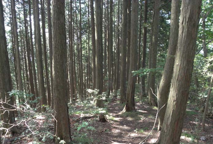 葛生の町から県道200号線で宮原まで車で入る。宮原で五丈の滝の道標に沿い左折して1kmほど入ると、右手に駐車場。ここから五丈の滝までは、標識もあり、道も整備されている。滝への林道の中間点で、林道が分岐、左に入り、大鳥屋山をまず目指した。林道終点から杉林の山道に入ったが、しばらくしてルートを見失う。そのまま杉の葉が覆う坂をほとんど直登する。ところどころカラーのマーキングテープが木に残り、登った人があるのが判る。尾根に出たが、大鳥屋山と岳の山の中間、どのあたりか判らず。深い杉山の中で、周辺の山や景色も見渡せない。左にしばらく歩き、、見渡してみても、先のピークらしき山は見えてこない。大鳥屋山までの道のり分からず、624m峰と思われるピークで折り返すことにした。登ってきた尾根上地点からそれほどの距離はなく、岩に取り付いてロープのある岩場の急な登りの上が岳の山頂上。704mは、大鳥屋山の693mより高い。石祠と石仏がある(写真下)。眺望はなし。ここから東に向け下りに入る。ところどころに石祠や石仏、信仰登山の山と見られるが、地震のあとなのか、くずれたままのものもあり、人気は減っている様子。ルート図をみると途中から右に沢に向け下ることになっているが、尾根をそのまま下ってしまった。写真上にあるように杉の木の下比較的広い場所は登りも下りもルートが判らなくなる。気がついた所はかなり下った後なので、戻らずに、木の間越しに見えた下の部落民家を目指し、急斜面の杉林を滑りながら下った。沢筋に下りたら、五丈の滝標識のある林道に出た。五丈の滝展望台に寄ったが、滝前の木が倒れて視界を塞ぎ、滝よく見えず。暑中の汗を水で流し、林道を下って駐車場に戻る。順調に歩けば4時間ぐらいの登山だったのだろうか。