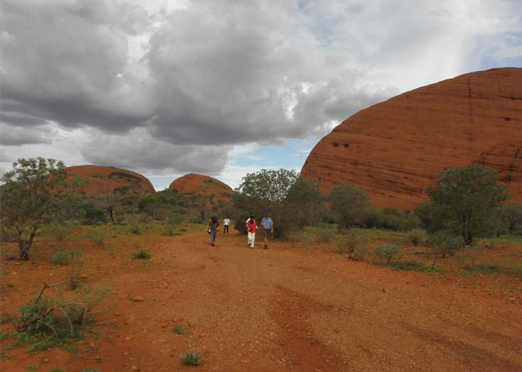 このウルルから30kmほど離れて、カタジュタという巨岩が連なってできた岩山がある。36個の赤い丸い頭の奇岩の群れ、登るルートはないが、岩の隙間、風の谷ウォークを見晴らし台までたどる。ナウシカの舞台として知られる気持のいい1時間ほどのコース、赤い岩地に花も咲いていた。