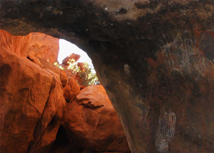 登山口から見ると、急な登りには、杭と鎖が設けられている。往復2−3時間コースとのこと。登れない人たちのために、岩の麓に周辺トレッキングルートができている。登山禁止の看板を横目に、Mala Walkと Mutitjulu Walkを歩く。途中、アポリジニの祭礼や休息のための聖地もあり、近づくことも写真撮影することも禁止されている場所もあるが、結構変化にとんだルートで愉しめた。洞窟や窪みに描かれた壁画は、1000年以上前のものもあり、何年かに亘り重ねて描かれてきたといわれるロックアート、見ごたえがあった。また、ウォーターホール、泉ができていて、周辺には、樹木が繁り、カワセミが飛んでいた。写真の泉は、Kantju Waterhole。