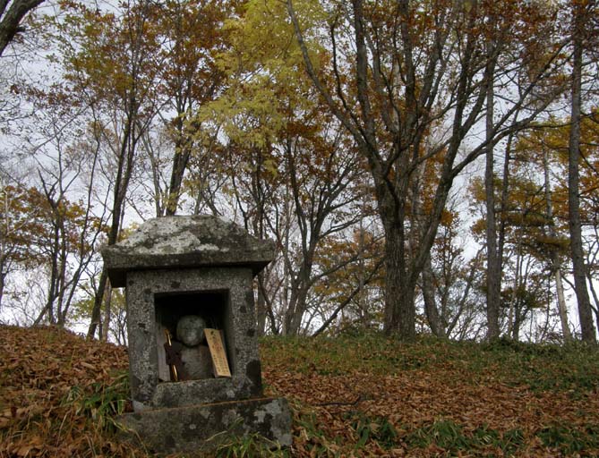 次の地蔵岳を目指す。峰をたどって、大岩山、唐梨子山、ハガタテ平で古峯神社から登ってくる登山道と合流、最後まわりこみながら登ると、地蔵岳頂上(1483m)。斜面に石祠(写真4枚目)。