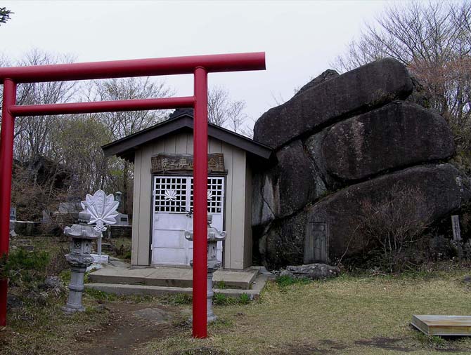 横根山からは、牧場の東側の柵に沿って、アップダウンしながらたどると大きな電波板のある方塞山(1388m)にたどりつく。横根山や牧場の展望を後にして、古峰高原を目指し、林に入る。途中のズミのトンネルが素晴らしい。20分ほどで、三枚石(写真2枚目)に出る。三つの巨大石と古峯神社奥社の鳥居があり、石像も増えた。