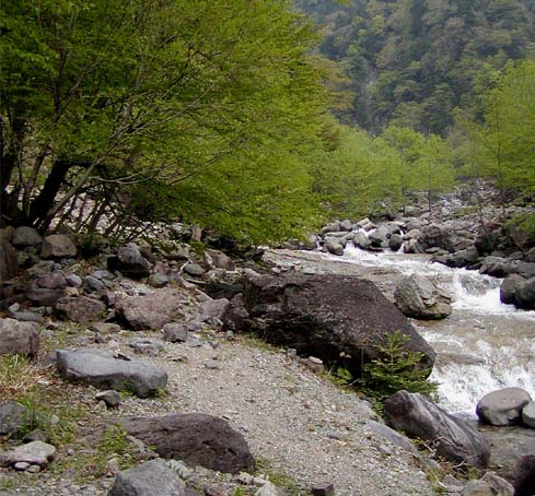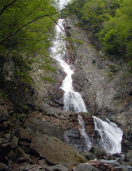 滑りやすい。ストックより、しっかりした長めの木の枝を使って飛び越えたほうがよい。ここからは川原を歩き、川を渡り、木立に入ったりするが、道がない。ペンキマーク、ケルン、テープを頼りに迷わないよう注意が要る。幸い、前の週に赤岩滝探勝のグループが入ったようで、マークがわかりやすかった。沢は、あまり狭く急峻ではないので、上の写真のように歩き安いところが続く。右岸から左岸に渡り、沢の分岐を左に行く柳沢から離れ、右の赤岩沢に入る。やがて岩を包むような小さなナメ滝に出る。この滝を川を渡って回り込み岩を越えると、突然のように赤岩滝が目の前にそそり立つ。落差100m、幅7m、雄大だ。高さ、優美さ、日光でも1,2を競うともいわれる。また、南向きで日を受けていて明るい。ただ、遠くからこの滝を眺められるところはないようだ。ここまで辿ってこないと見られない。それだけ見ごたえはある。バス停から歩いて2時間弱。帰りは折り返して、西ノ湖に出、自然林の中を千手が浜まで歩いた。初夏だと、クリンソウ、ニリンソウ、フッキソウやカリガネソウなど花に出会える。