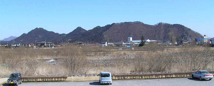 今市市街の方向から大谷川を越えて、北東の方向に見えるのが茶臼山と峰を連ねた毘沙門山にいたる山並みだ(写真上)。右のピークが茶臼山、左端のピークが毘沙門山になる。中間のフラットな山と三角ピークには名前がない。