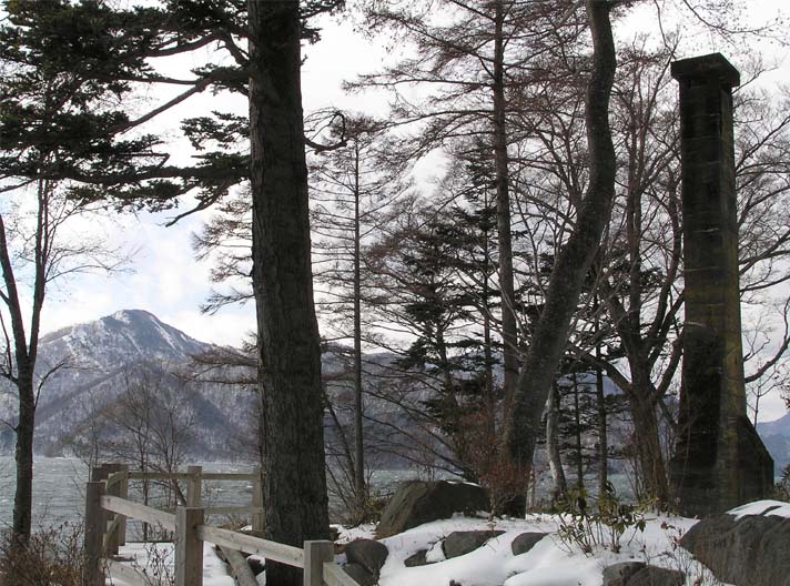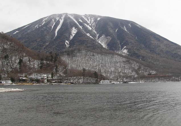 湖畔東端の中善寺温泉は、ホテルや店の通り、船の桟橋が、新しく整備され、以前の温泉街の煩雑さが緩和され、明るくなった。ただ、湖畔はコンクリートの上が凍り、雪が重なって滑るし、遮る木もなくて風がまともに襲う。歩き出しは、二荒山神社中宮祠前からにする。湖畔に沿ってしっかりした歩道が続く。菖蒲が浜まで車道に並行して、湖水沿いの旧車道の道で、階段、ベンチも適所に設けられている。木の階段と歩道のある大崎の西六番は、外国人別荘で賑わった展望場所、別荘暖炉の煙突がシンボルで残る(写真上)。湖岸の道は、冬で踏み跡も少ないが、雪でも歩きやすい。木立の中で、風も強くは無い。途中、両棲類研究所・サンショウウオ博物館だった三角屋根の建物がある。もう閉鎖して何年か経つ。湖畔の別荘や保養所などの建物も閉鎖されているのもあって、寂しい。湖の対岸の半月山、社山、黒檜山のスカイラインを眺めながらしばらく歩いて、ボートハウスに出る。林の中にある中善寺金谷ホテルの前身、日光観光ホテルの付帯施設として戦後建てられたもので、国際避暑地としての歴史の見学ができるが、冬は閉鎖。回り込んで、雪で滑りやすい階段を登ると、菖蒲が浜遊覧船発着所に出る。停泊中の遊覧船の沖にオオバンの群れが波に揺れていた。その先は、菖蒲が浜のキャンプ場につながり、半島の先の砂浜に出る。振り返ると雪の男体山の容姿、湖畔のボートハウスと遊覧船が一望できる(写真下)。湖畔歩道はここで終わり、車道に戻って、ボート発電所、養魚研究所、竜頭の滝と観光地につながる。