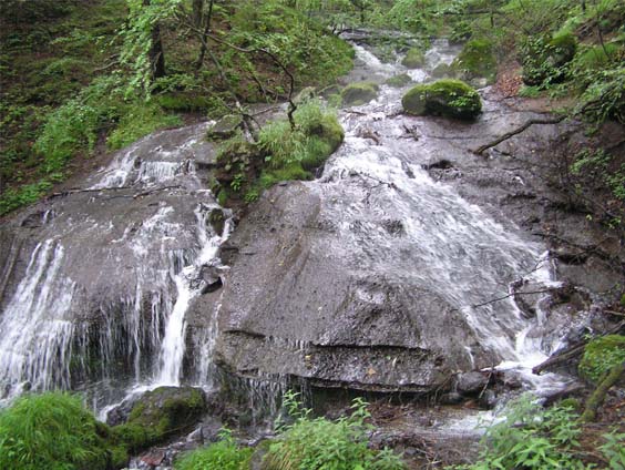寂光の滝駐車場から、寂光の滝は歩いてすぐ、高さ50m、七段あり、別名七滝、きれいな滝だ。駐車場あたりは、かって寂光寺があり、修行者で賑わったようだが、今は消失したまま、若子神社が残る。神社の脇を回り、女峰山登山ルートを尾根伝いに登る。途中、尾根道から左に分かれ、沢に下りて行くと、寂光の滝の上部に出る。滝の一部が上から眺められる。ここから沢歩きが始まる。ずっと左岸を歩く、沢の水はそんなに多くないので、対岸にも渡れるが、左をキープしたほうがいい。また、流れが狭くなり、岩にぶつかって沢伝いに歩けないところもあるが、よく見ると斜面を高巻くルートがある。ただ、雨の後で判別しにくかったり、獣道と間違うところもあり、注意がいる。沢の水は冷たく、広葉樹の緑で陽が入らない道を沢に沿ってひたすら歩く。急斜面は少ない。炭焼きをした後だろうか、石積み跡も見られる。時に、無名な小さな滝に出会う。何段かの滝、右から壁を落ちるシャワー滝、そして写真上のなめ滝。このなめ滝を越えて、上に出ると沢が広がり、平坦な水源地に出る。ここが寂光沢の源流、右側斜面下から水が湧き出し、冷たくておいしい。濃い緑の中、苔むした岩、湧き水の広がり、ちょっとした幽玄の世界。
