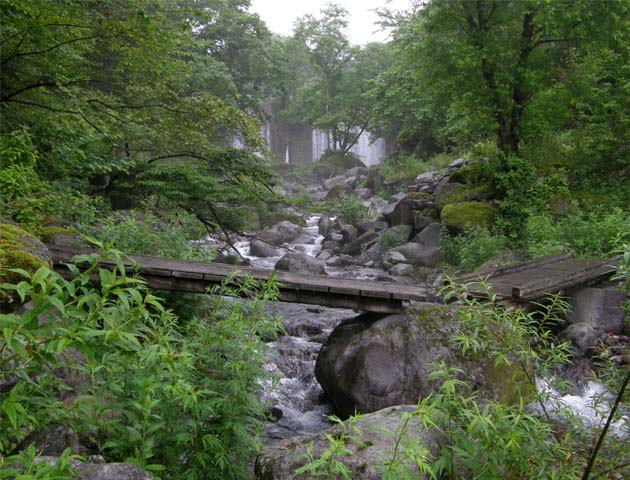 霧降高原は、いま、ニッコウキスゲの花の時期、でも、今回の見晴台歩道ではキスゲに出逢えない。霧降高原道路を登り、ニッコウキスゲの咲くチロリン村を通り過ぎて、しばらくして、左手に「見晴台2.1キロ」の道標、判り難いが通り過ぎると、先に高原歩道入口のバス停があり、戻る。車で入り、余裕のあるところで駐車、先は川で遮断、その下に、歩道が始まり、川を渡る。板橋があった。まだ残っているだろうか(写真上)。この川は鳴沢といい、大谷川に注ぐ。川を渡ると、ジグザグの滑りやすい登り、少し平坦になってくるが、カラマツの下、ササが深くなる。登りと平坦な笹道が続き、カラマツと白いポールで支えられた植樹の林を1時間あまり歩く。ササが深く、狭い歩道でわかり難くなってくるが、登りきって、開けて見晴台に出る(写真下)。途中、「見晴台..キロ」の標示があり、展望も望める。見晴台は,緩やかな斜面の上、笹原が開け、女峰山や高原山、日光の街の方向が見渡せる。車だと駐車場所まで折り返しになるが、歩いて滝尾神社に下ることもできる。ただ、下ったところから、神社まで長い。