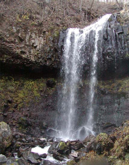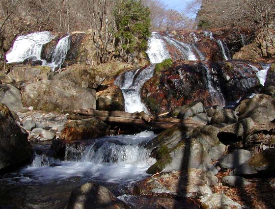 スタートは、霧降高原有料道路から分かれた霧降の滝観瀑台への途中、駐車場からつつじヶ丘から入る。春、一面のヤマツツジのトンネルになる丘を越えて、杉林の階段状の坂を下る。霧降川に出るが、ここは霧降の滝の上に当たる。川を下ると滝上に出るが滑りやすく、急降下で滝に落ちるので、近づかないほうがいい。川には丸太の橋があったり、無かったりするが、渡って対岸に道が上流に伸びている。途中、大山に登る道が右から山に入っているが、川に沿って左岸を辿る。しばらくして丁字滝の標識があり、左に分岐した丁字沢に渡る。道を下ると丁字滝の滝口まで下り、滝を眺めることができる。霧降川に戻って、また川筋を歩くと、二つ目の玉簾滝に出る。赤茶色の岩を分けていく筋にも分かれて流れ落ちる滝は、秋の紅葉を背景に見事な景観。水量が少ないと、スダレの感じがもっと出るのではと思われる(写真上)。滝のところまで下りられるし、滝の上部は歩道からも眺められる。なお上流に歩くと、大山への登山道を分け、車道に出る。この車道の上から川に出ると、三つ目のマックラ滝が左奥に見える。左から注ぎ込んでいる冷沢の滝だが、滝まで歩道ができていて滝の下、いろいろな角度から、柱状節理の岩をまっすぐに落ちる滝が眺められる(写真下)。マックラとは、カタカナの名だが、真黒からとか、アイヌ語のマクン:奥にある意とか定かなことはわからない。手前の林道は、奥に霧降牧場へ通じ、反対には、有料道路に出る。道路を、女峰山を背景の高原を眺めながら下ると元の駐車場へ戻れるし、途中から丁字滝へ下りるルートもある。