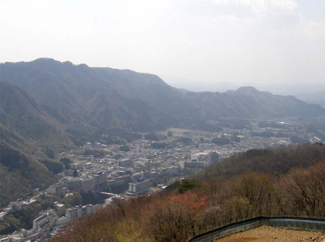 鬼怒川温泉から、丸山には「おさるの山ロープウェイ」があるが、山麓駅に駐車して、花の山ハイキングコースを登る。歩道は、急な登りもあるが、木の階段などよく整備されていて歩きやすい(1時間足らず)。近道コースが案内にはあったが、見当たらず。回りこんだ道で、ヤマザクラ、ヤブツバキがところどころで見られた。登ったところは、赤い鳥居の神社、下るとロープウェイ駅、おさるの山から鬼怒川温泉が一望できる(写真下)。神社を通り、尾根道を緩やかに登り、丸山を回りこんで、30分ほどで一本杉に出る。 |