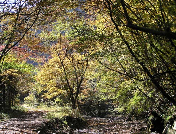 鬼怒川温泉、竜王峡の先、国道が会津方面と川俣温泉方面へと分かれる。川俣方面に向かい橋を渡ってすぐ左に入る道があり、しばらく行くと車道はゲートでクローズされていて、ここに駐車。川に向けて下ると、浜子橋に出る。ここからの景観はすばらしい。龍王峡の上に当たり、この下で逆川が分かれている。ゲートから車道を歩くことになる。林道は一本杉まで入っているが、クローズされている上、崩壊個所もあって、歩くしかない。でも歩道としてみれば、広く判りやすい。逆川沿いの道は下にいくつもの滝が見られ、トンネルもあったり、30分ほどの歩きだ。恋路沢が分岐するところで、林道も分岐し、左に入る。ここからは、小さな清流沿い歩きで30分、恋路沢の名前通りで、両岸の紅葉が日に映えて見事だ(写真上)。ところどころで山側の岩壁と紅葉もみられ、これもすばらしい。やがて恋路沢出合で、沢から分かれ、林道をジグザグに登る。尾根に出たあたりから、展望も開け、長いけれど比較的歩きやすい草の伸びた林道が続く。足元にリンドウの青い花、恋路沢出合から1時間、一本杉に出る。開けた峠のようなところで、銘木の一本杉、あずまやの休憩所がある。