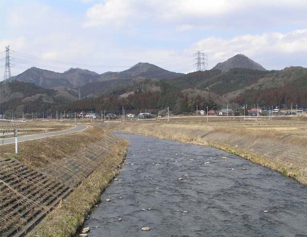 篠井の田園地帯、田川の左岸に篠井富屋連峰が連なる。今回の登山は、篠井側、上の写真の田川の向こうに見える山、左から榛名山、男山、本山、右のピークは飯盛山でこの右に富屋の山が続く。