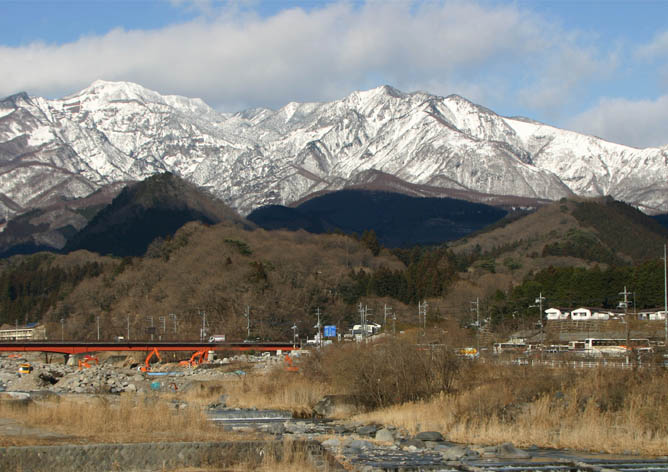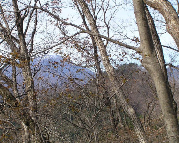 日光の街から大谷川の霧降大橋を渡って左側に、小倉山森林公園がある。林の中の小道、大谷川の左岸、台地の上になるので、歩くと葉の落ちた木立の間から、日光市街の家並みが望める。野鳥の観察地にもなっていて、冬の鳥たちにも出会える。木彫りの工芸センターやふるさと民家など観光施設もあり、晴れた日にはチョッとした冬のウォーキングに快適なスポットだ。小倉山はこの北側、アイスアリーナの奥になる。山に入る人が少ないのか、登山口、登山道ともはっきりしない、標識もない。大谷川の対岸から見ると、写真上のように、雪山になった女峰山(左)と赤薙山(右)の手前、左側のピークの外山、右端の双耳ピークの小倉山が見える。山の左は広葉樹林、右は針葉樹林とはっきり分かれている。森林公園の上を横切る車道の山側、乗馬倶楽部の白い牧柵に「日光古式馬術保存会」の柱があり、牧柵の東端から林に入る。道がはっきりしないが、尾根に向けて登る。頂上までずっと尾根を登ることになるので、トレースが判りにくいが迷うことはない。最初は桧や松、上は杉が右側に続き、下の鳴沢の水音が聞こえてくる。左は落葉樹林帯なので、途中、下の写真のように、男体山、外山が見え隠れし、歩くのに苦はない。登山中ほどで、三叉路に出会い、車が通れるぐらいの道が横切るが、ここは直登。急なのぼりの後、双耳の一方のピークがあり、左まわりに平坦な小道を辿ると山頂に着く。三角点はなし、山の名札が二個あって、標高754mを示している。頂上も含め、開けた展望地はないが、冬には木の間越しの景色が十分楽しめる。30分ほどの登りで、冬、チョット汗をかくて程度のトレッキングができた。