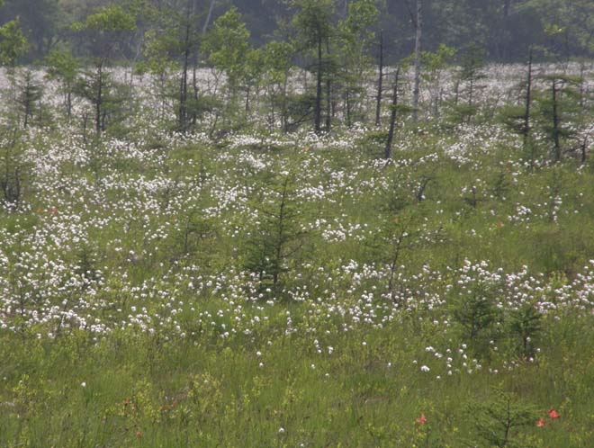 どのルートも、快適に歩けるが、夏の楽しみは、野鳥や花に出逢えること。7月のはじめまで、ワタスゲの白い絨毯が草原を飾る(写真下)、奥のほうには少し大きめのサギスゲ、白い花の中に、レンゲツツジのオレンジの花、アヤメの青、ウマノアシガタの黄色、足元にピンクのハクサンフウロ、8月に入ると、ホザキシモツケ、ノアザミ、よく探すと、もっといろいろの花にも出逢える。夏は夏休み中の子ども達も含め、人は多い。人の少なくなった、秋から冬を越し早春の頃もまた違ったハイキングができる。 |