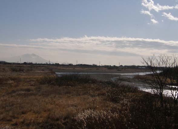 鬼怒川の河原を歩いてみる。今回訪れたのは、田川と鬼怒川の合流点。田川は、日光市から発し、宇都宮市の市街の中心を流れ、茨城県の結城市、下館市の久保田河岸のところで鬼怒川と合流している。この久保田河岸のことは、前回、蕪村の句碑で触れた。しかし、田川の本流は、もっと上流の田川放水路で鬼怒川に注ぐ、左岸が二宮の西大島、右岸が小山市の延岡に跨る。延岡側の合流点には、一里塚のモニュメントがあり、広いアシの河原の遠方に筑波山が聳えている(写真上)。