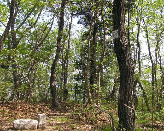 日光街道19号線の宇都宮と今市の境、山口から北に入る。分かりにくいが、目印は山口バス停。「山口公民館」、「なかよしひろば」を通り、田んぼの中を、左に右にまわり、野鹿台の住宅団地に入る。住宅地を通り抜けて山に向かって坂を上がる。団地内は分かり難い、左の方向へ行くと、現代的な三重塔(住宅用か何かの記念建物か案内はない)があるが、こちらは方向違い。山に向けて奥まで登る。残念ながら、駐車場がない。幸いなことに通りがかりの夫人が空いた駐車場を貸してくれた。登りの終点から山に入る。ここも分かり難い、案内標識もない。林道のような道から踏み後を辿る感じで、沢筋をスギ、ヒノキの林を登る。落ち葉で滑り、歩きにくい、急な斜面をつめ、スギ、ヒノキからミズナラ、コナラの広葉樹に変わり、尾根の稜線に出る。稜線が分かれるところから右に回りこみ、緩やかな尾根を進むと山頂(写真下)。山頂は広がりがあり、三角点(446m)もあるが、展望は望めず。樹林越しに日光方向の山がちらほら見える。登り30分強。林の中の登山で、眺望はよくないが、春の花には恵まれた。足元には、チゴユリ、ホウチヤクソウ、ニリンソウ。時期にはヤマツツジ、アカヤシオが咲くはず。下山路は、尾根をずっと下る道もあるとガイド書かれていたが、分かりにくくて難路、もとのルートを辿った。登山客はあまり無いと思われる山だが、春先、冬で鈍った足慣らしには適当、のどかな花見トレッキングができる。 |