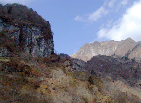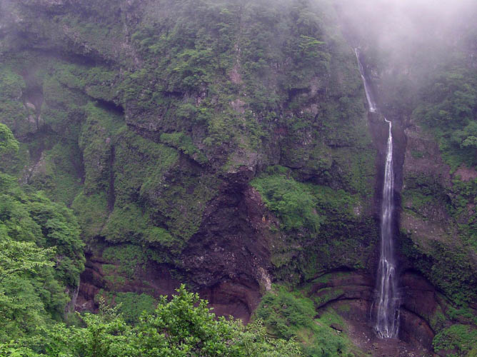 まず、滝尾神社の脇を登る林道を、遮断ゲートがあるところまで入る。数台分の駐車ができ、ゲートの先は、右が霧降高原への道、左が雲竜渓谷に至る林道になる。車で十分乗り入れられるしっかりした道路だけれど、意地悪く止められ、ひたすら林道歩きが2時間ほど続く。途中、日向砂防ダムを見下ろす展望台、ダム工事記録の説明があり、昭和53年完成とあり、30年経過することになる。もうダムは、ほとんど砂で埋まっている。林道はこの先、殉職の碑を過ぎ、まもなく道が下りになって、分岐で渓谷に下る。渓谷に出て、林道は終点、監視カメラがある展望所になっている。川に下りて、渓谷の沢登りで、雲龍の滝に辿れるはずなのだが、沢を誤って、手こずりながら長い時間をかけて入ったところは、絶壁で行き止まり。絶壁を流れ下る無名の細い滝をいくつか見て、このときは時間も浪費してしまって雲龍瀑は諦めた。秋の紅葉の頃だった。初夏2回目の挑戦は、対岸から滝を展望するルートをとった。林道終点近くの分岐を、右折して渓谷に下りずに直進する。左からメシ沢という急峻な沢が落ちているところからすぐに行き詰まりになる。林道は崩れた岩石に埋まり、歩道も消えかける。上の写真の左、ツバメ岩の大岩壁の下を張り付いて歩くことになる。我慢して歩くと、右の渓谷を越え、雲龍瀑が望めるようになる。しばらく岩壁の下、観瀑展望の歩きはできるが、踏み後も途絶える。岩壁からの落石があり、右は急勾配で谷に落ちている。直前に大崩壊があったらしく、これを越えるのに難儀した。ツバメ岩を回り込んだところで、ついに行き詰まる。リスク大の歩行だったが、観瀑は、霧の流れの向こう100mは越える滝がずっと見られ感動もの。その上、岩壁にはコウシンソウやユキワリソウの群生、足元にはウスユキソウやイワハタザオなど花が咲き乱れていて、報われた。