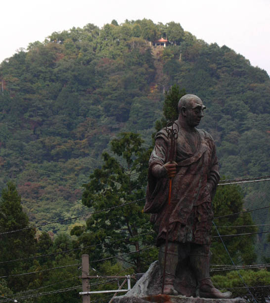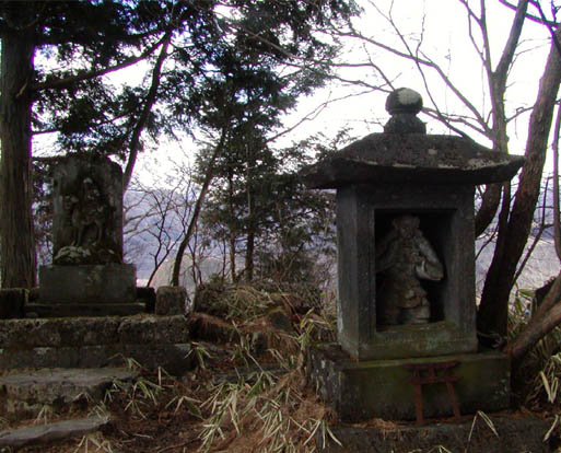 初めに気になったのは、神橋にまつわる話(2.神橋を参考)。勝道上人が大谷川を渡るのを援けた深沙大王は、深沙王堂に神橋と車道を隔てて祀られている。二匹の蛇を投げて橋の替わりにしたと伝えられる。深沙大王は、毘沙門天の化身と言われ、三蔵法師が仏教の法典を求めてインドへ旅したとき、危難を救ったとも伝えられる。東京、調布の深大寺が、縁結びの神様として知られるが、「商売繁盛」の信仰もある。化身の元、毘沙門天は、日光でも知られる神様だ。輪王寺の勝道上人像の後方、外山の上、赤い屋根の毘沙門天堂が見える(写真上)。外山の山頂には、毘沙門天の石像(写真下)が祀られ、毎年正月の祭りには大勢の参拝客で賑わうようだ。毘沙門天は、勝負事の神様と言われるが、ここでは、福の神。福銭貸しという祭り行事があって、福銭を借りて事業を成し、翌年倍にして返す、という伝統があるとのこと。