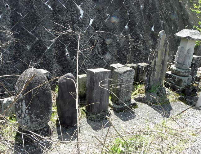 この町並みを見下ろすように、段丘上の清原中央小学校の西、坂道の上、地蔵が座っている(写真1)。宝珠錫杖を抱いた姿で享保5年(1720)の紀年銘がある。その隣に青面金剛、欠けているけれど三猿付の庚申塔(写真2)もあり、これは延亨元年(1744)。どちらも河岸が栄えたころの信仰の遺産として残る。この坂道の途中、石仏が集められた所(写真3)があり、馬頭観音や馬力神が並ぶ。馬頭観音には、元治2年(1865)のものがあるが、明治7年、大正6年と比較的新しい。馬力神の方は、紀年銘の読み取れるもので明治42年、ほかに大正11年の勝善神(名馬の誕生を祈願したもの)も見られる。板戸河岸では、江戸時代の馬頭観音が主だったのに比べ、こちらは明治時代以降と近代に近い。明治に入り、神仏分離で廃仏から神社信仰に移ってきた名残がここでもみられるのか、愛馬供養に、馬頭観音から馬力神が立てられるようになった歴史がうかがわれる。ここには、六面地蔵仏もあるが、いつのものかは判らない。