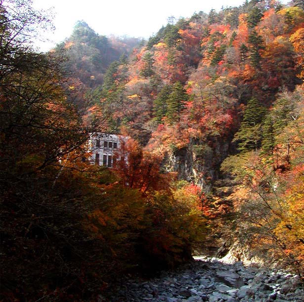 いろは坂を下って、「ん」を過ぎ、渓谷に向かう横道に分かれ入ってゆくと、大谷川に出、橋の先に白い建物が見える。馬道発電所だが、立ち入り禁止で近づけない。写真下に見るように、モミジの頃は渓谷をバックに絶景、写真撮影の穴場でもある。春には新緑とヤシオツツジが渓谷に彩りを添え、これも見ごたえがある。