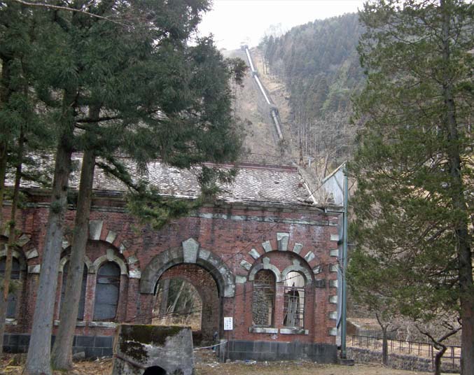 いろは坂に向かう途中、足尾に抜ける道路が分岐している。ここの細尾の部落の奥、山にかけて写真上の細尾発電所が、池を囲んで大きく広がっている。また、明治39年建てられた発電所のレンガ造りの建屋(写真中)が廃墟だが、山裾に残っている。写真で見るように落差が長く、200mを越える。大谷川の華厳滝の下あたりから取水してきている。華厳渓谷からの取水で、いま、馬道、背戸山、細尾、上の代の4発電所があるという。