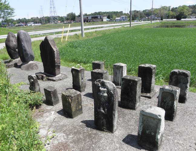 板戸の河岸跡を訪ねてみた。鬼怒川左岸の堤防の上、東屋ができていて、一里塚と鬼怒の船頭唄の碑が並ぶ(写真1)。板戸部落の中には寺や神社もあるけれど、慶長3年開設という河岸の面影は見られない。堤防の下、農道の脇に石仏がいくつか並んでいた(写真2)。多くは、馬頭観音で、記銘年を見たら、文化12年(1815)、萬延元年(1840)、明治11年(1878)と、河岸が栄えていたころのものとわかる。三面六臂馬頭観音塔(寛政3年)、勝善神(明治39年)の大きな石仏もある。川の舟、陸の馬と馬を大事にしていたことがわかる。観音仏は一群となって、コンクリートで固められていて、家並の中に散在していたのを近年集められたものらしい。