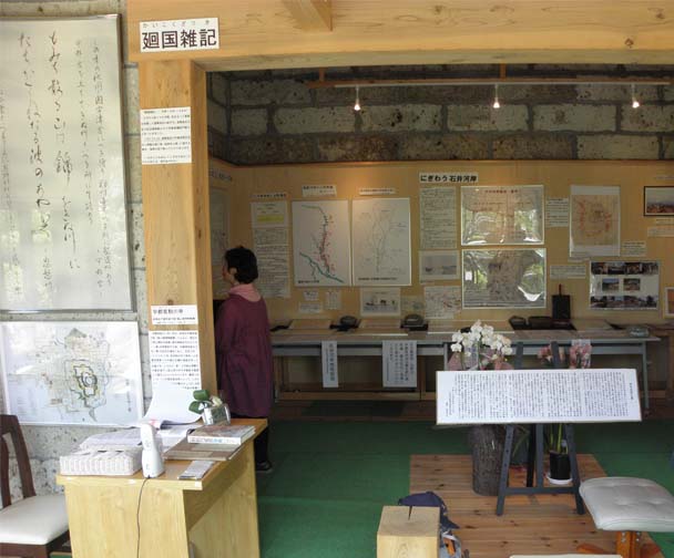 下って、石井まで来ても、河岸痕跡は見当たらない。鬼怒川にかかる鬼怒橋は、大正4年、木製で作られ、船輸送から車輸送に変り河岸が消えていったころの名残、今の鉄橋は昭和6年架橋(写真3)、橋の下から飛山城跡を望む。この橋から1kmほど下った右岸、桜づつみの下、土手を下った民家の中に、「石井河岸菊池記念歴史館」があった(写真4)。河岸の歴史資料を集め展示している個人運営の展示場で、今年、特別展が開かれていた。アメリカ、南北戦争でも名を成したグラント将軍が、第18代大統領として、石井河岸を訪れた記録が見つかったことの記念展示だった。日光見物の折(明治12年)、石井河岸のそばにあった生糸製糸場(明治4年、製糸試験場設立の大崎商会)を視察、当時の日本の工業状況を見学した。この試験場跡は、鬼怒川左岸、どのあたりだったのかはわからない。